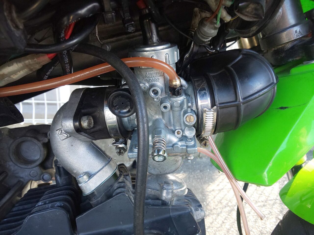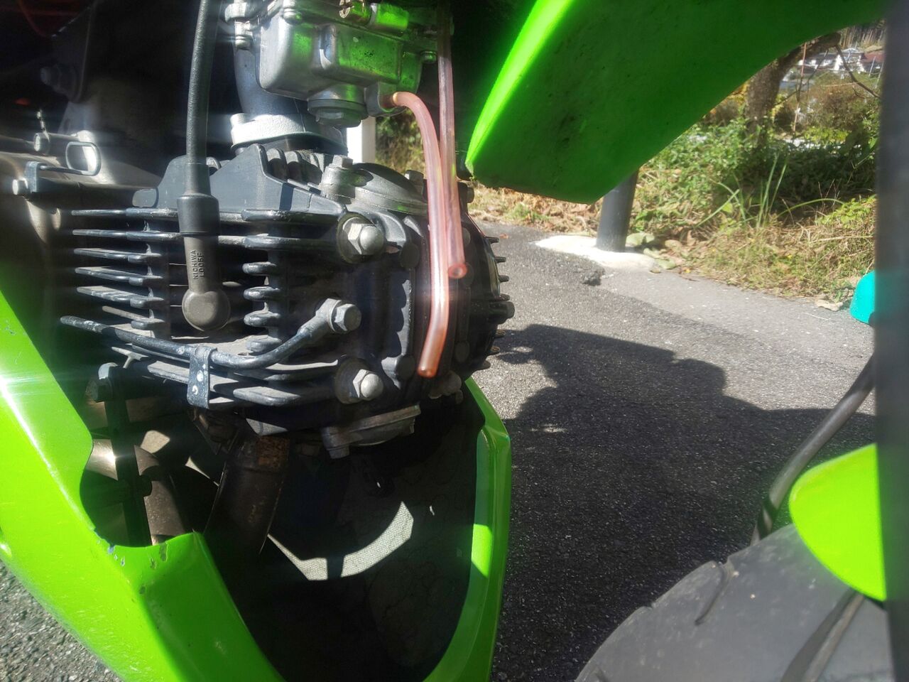 キャブのオーバーフローのホースからガソリンがポタポタと…w😇