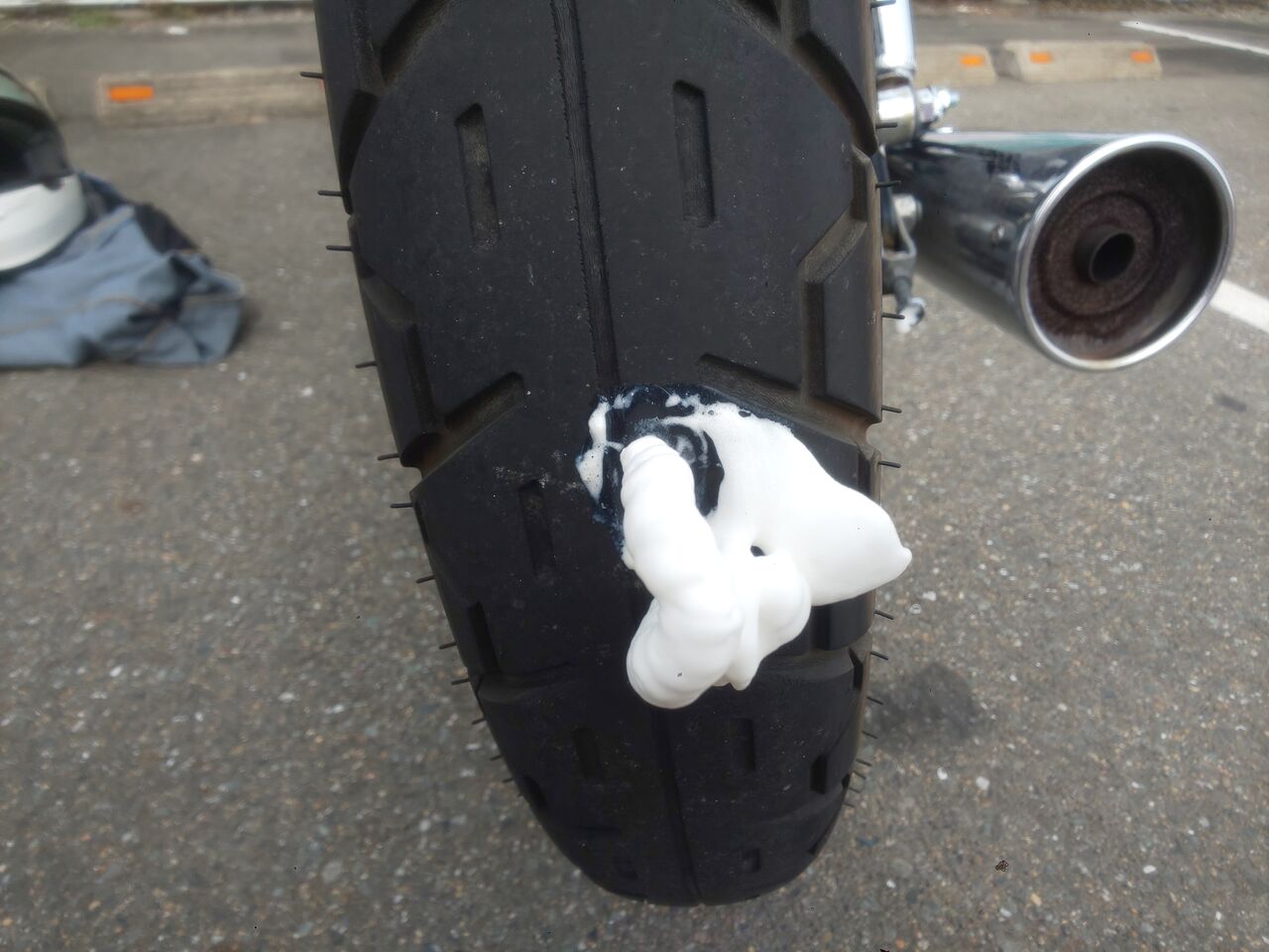 後でわかるんですけど金属片がタイヤの中に入り込んじゃってて、そいつを取り除かない限り穴が塞がるわけない状態だったのでいくら修理剤ぶちこんでも無意味でした…