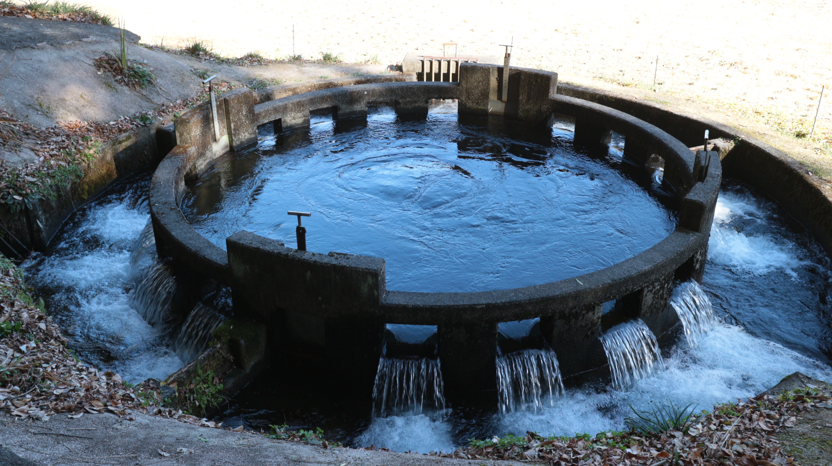 地下から入って上に上がった水を円形に流すことでいつでも平等に水を分けることができる…みたいな