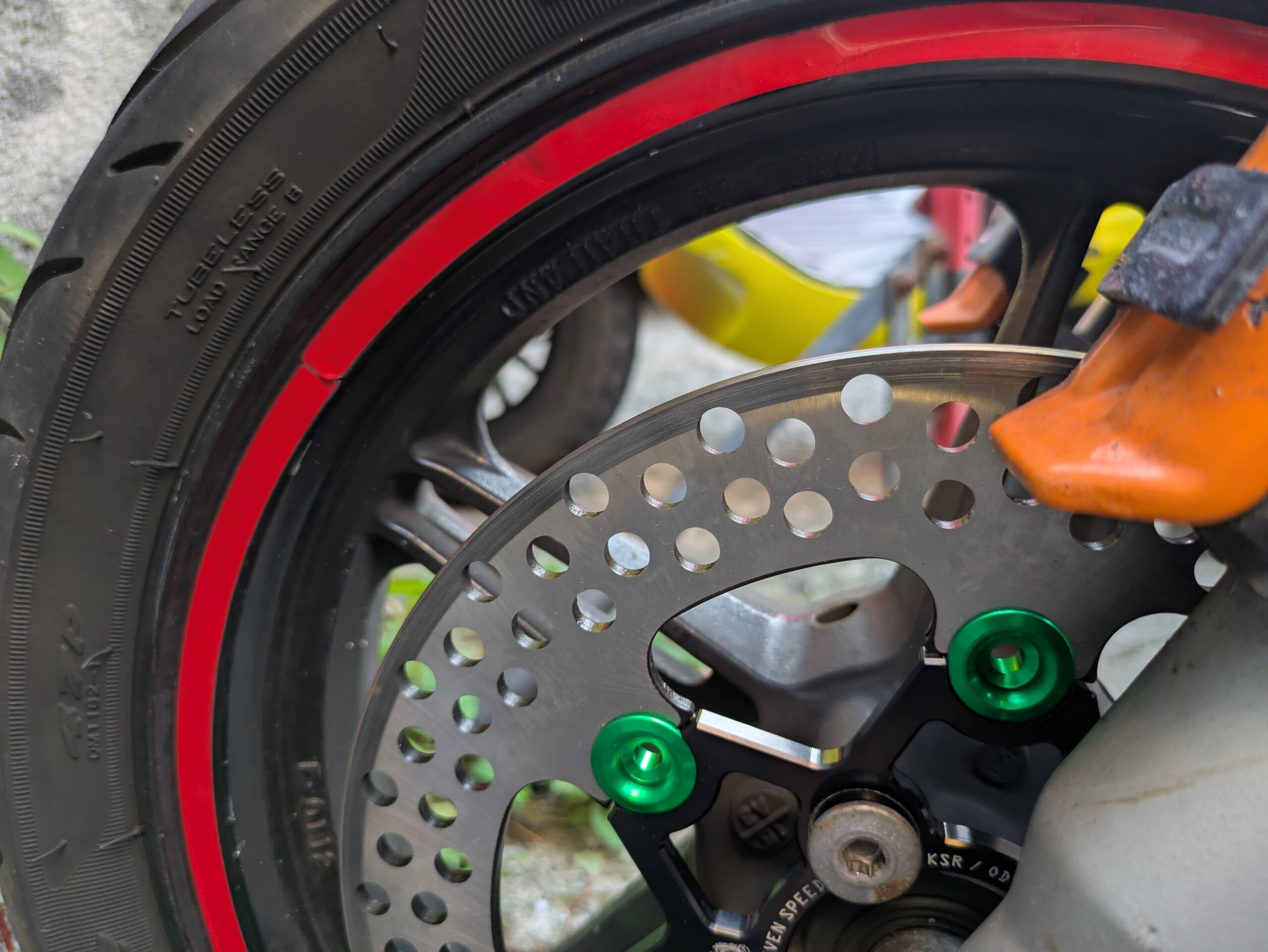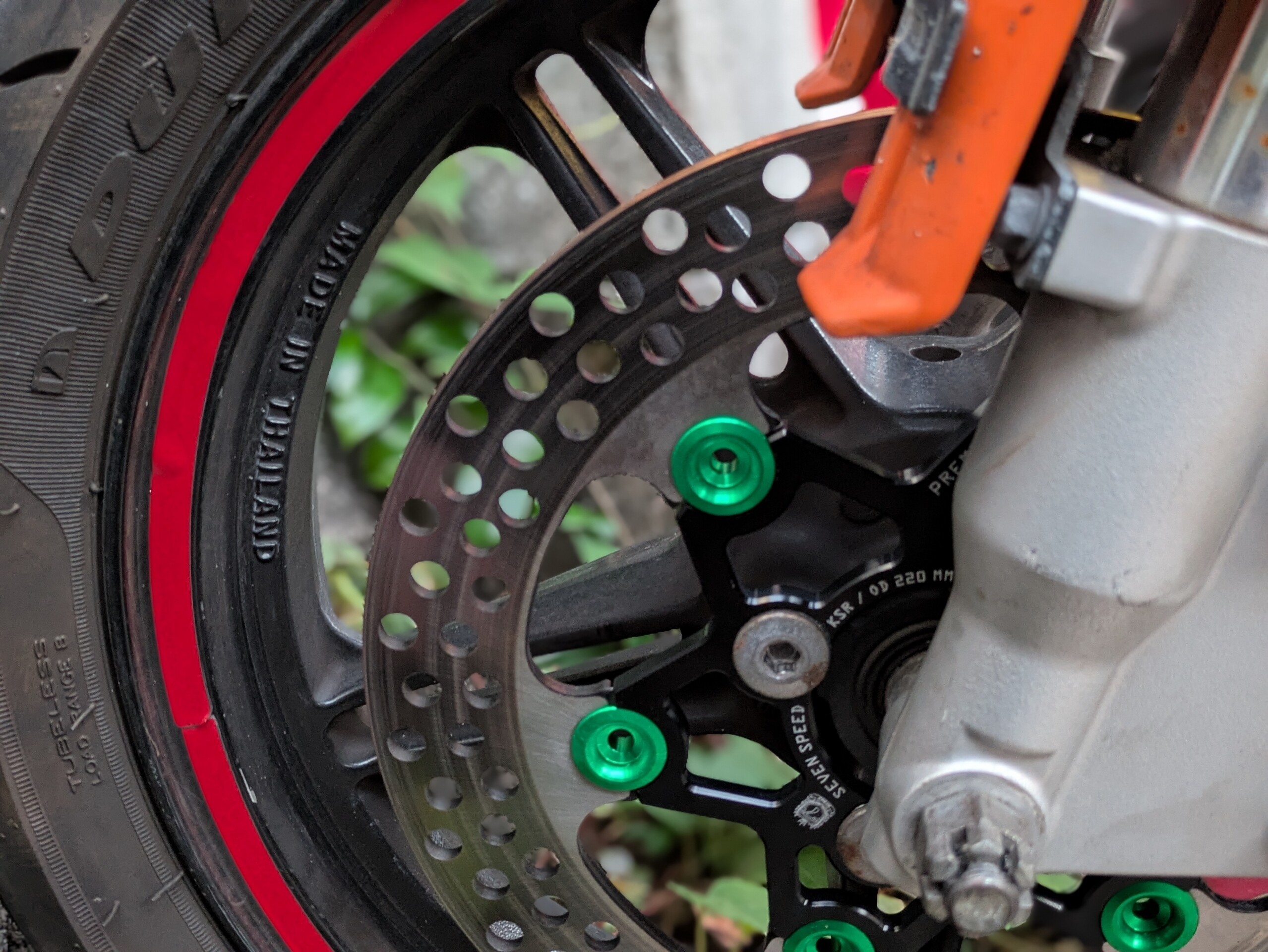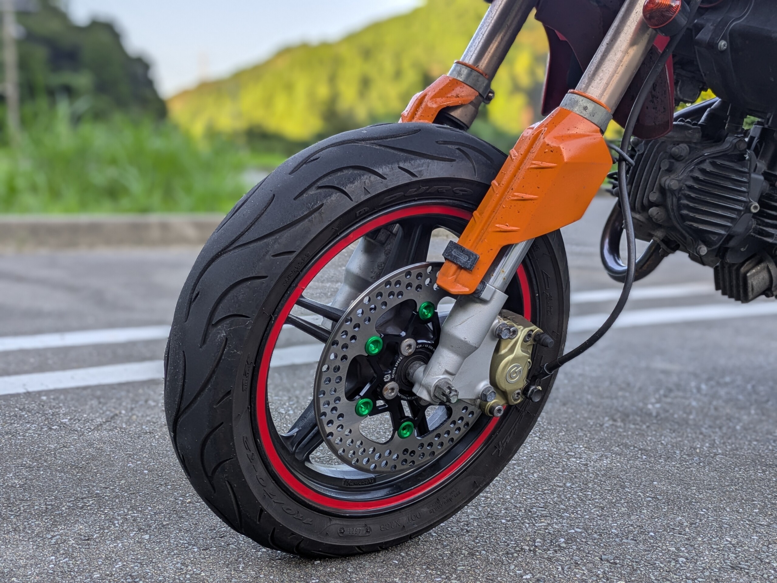 タケガワの200mmローター&カニキャリパー構成の二号機KSR110のフロントブレーキ